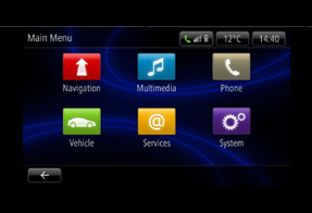 Un menu principal constitué de 6 icônes donne accès à différents mondes : Navigation connectée TomTom®, Multimédia (radio, musique, photo & vidéo), Téléphonie, Véhicule (Driving ECO²…), Services (le monde connecté et ses apps) et Réglages système.